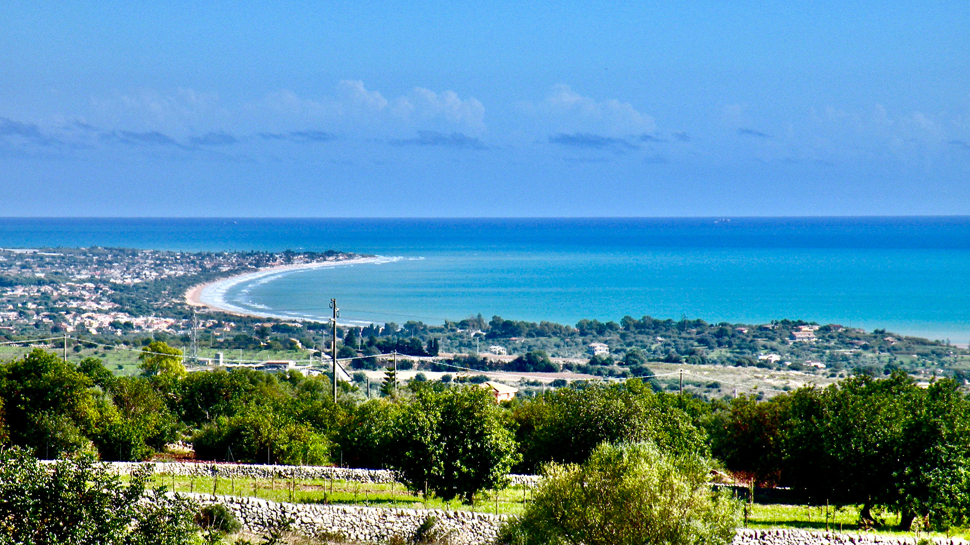 Der Blick durch die Fenstertür meines Schlafzimmers geht, gefiltert durch das Insektengitter, hinaus auf Bruchsteinmauern und Kapernsträucher, vorbei am Carrubo auf Ackerland, weitere Mauern, Olivenhaine und schliesslich auf die sichelförmige Küstenlinie bei Santa Maria del Focallo und auf das Capo Passero.