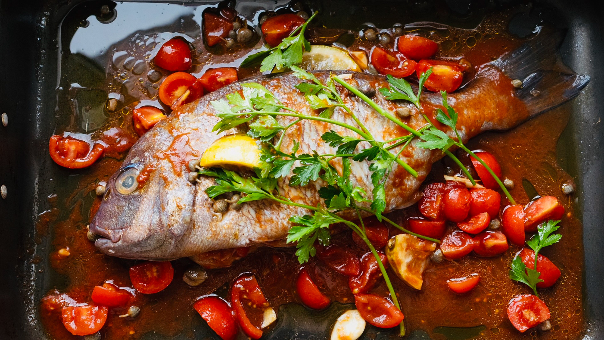 Dentice (Zahnbarsch) an Tomatencauce. Gekocht in der Villa Mariella. Foto Nicolas Eyer