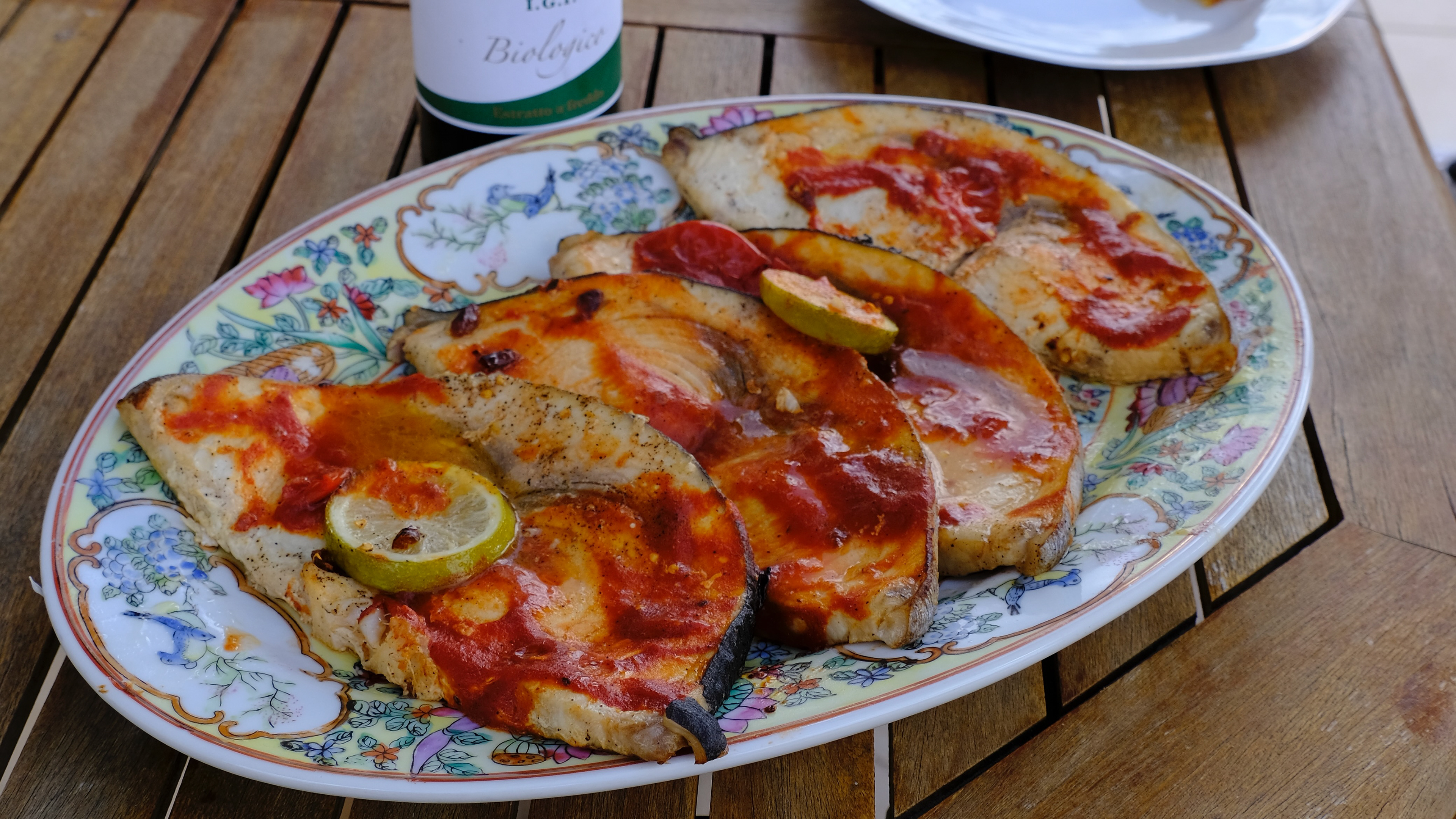 Pesce Spada alla Ghiotta - Schwertfisch an Tomatencauce. Gekocht in der Villa Casa Giorgio. Foto Nicolas Eyer