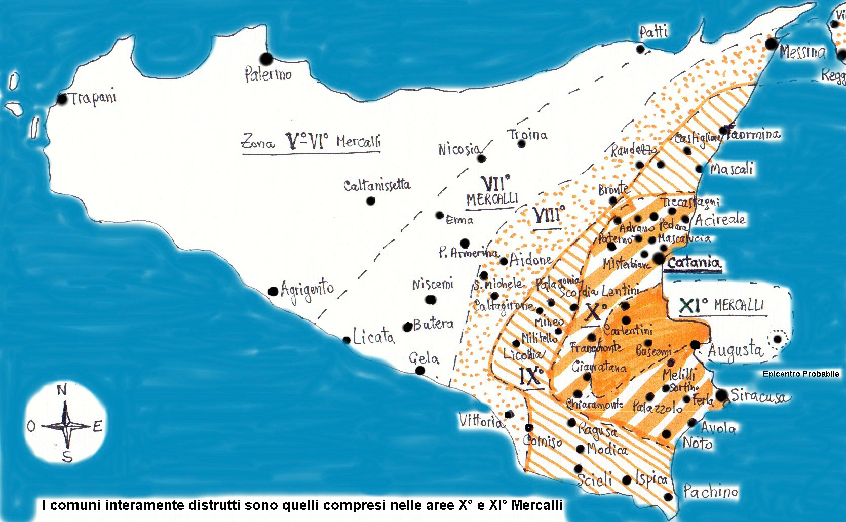 Copyright by Anthos (Antonino Taverna). Mappa delle località della Sicilia colpite dal sisma del 1693.