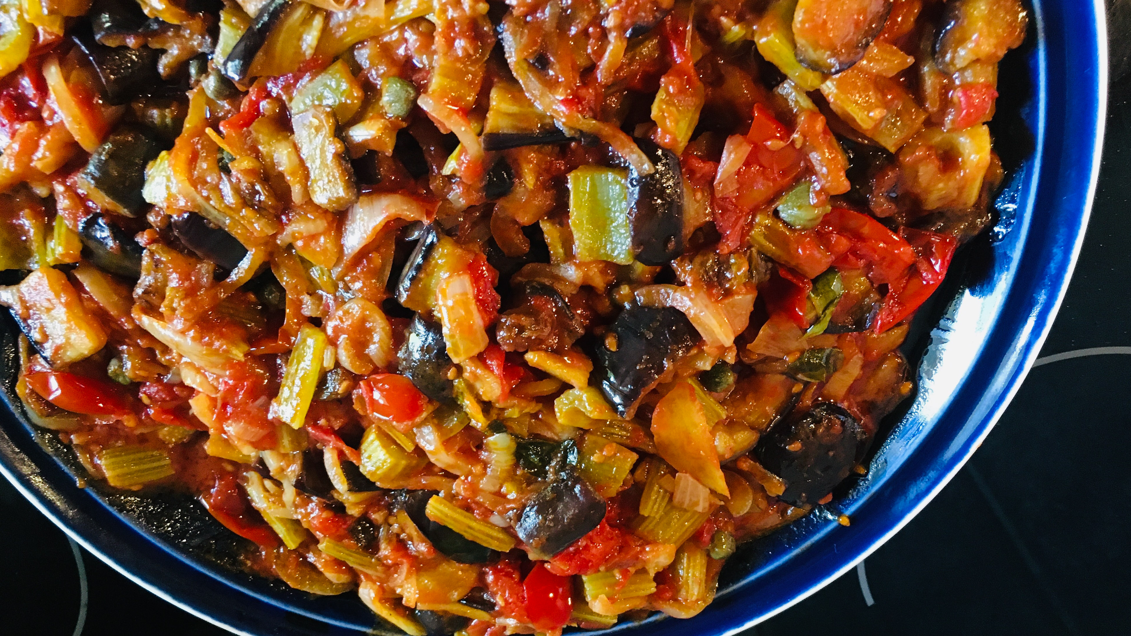 Caponata. Ein einfaches Gericht aus Auberginen, Sellerie, Tomaten, Kapern und Oliven. Süss-sauer. Foto Nicolas Eyer