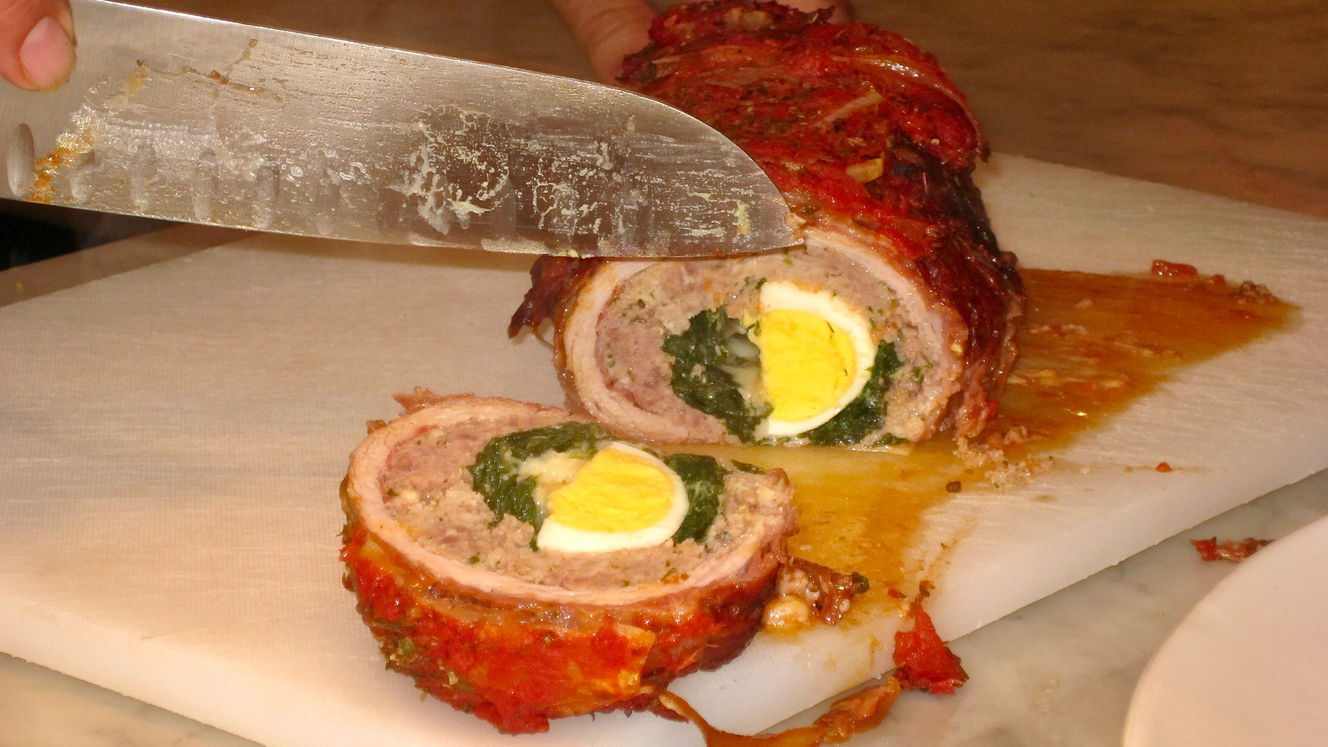 Die Rinderkeule, auch bekannt als Rouladenfleisch, wird mit hauchdünnen Scheiben vom Bauchspeck belegt. Gefüllt wird der Rollbraten mit Rindshackfleisch, altbackenem Brot, hartgesottenen Eiern, Caciocavallokäse, Zwiebeln, Knoblauch, gekochtem Schinken, Olivenöl, Sellerie, Möhren, Tomatenmark, Petersilie und Origano. Ein veritables „Innenleben“ also für diesen gefüllten Rollbraten, der früher bei armen Leuten auf den Tisch gekommen ist.