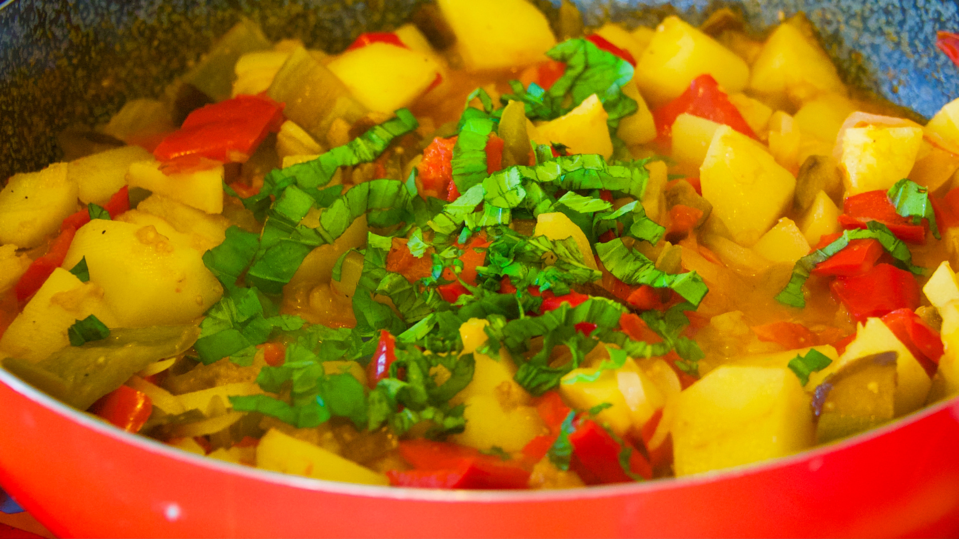 Eine Peperonata wird nicht einfach in ein paar Minuten gekocht. Umsomehr, als jetzt die Kartoffeln in die Pfanne kommen. Diese sollen sehr langsam zusammen mit dem Gemüse weich kochen. Deshalb dauert die Kochzeit gut und gerne eine Dreiviertelstunde. Regelmässig muss kaltes Wasser hinzugefügt werden und auch eine Prise Salz darf nicht fehlen. Zuletzt wird noch reichlich Basilikum vorsichtig unter die weichen Kartoffeln und das Gemüse gehoben. Jetzt ist unsere Peperonata fertig gekocht und kühlt nun in der Pfanne aus.