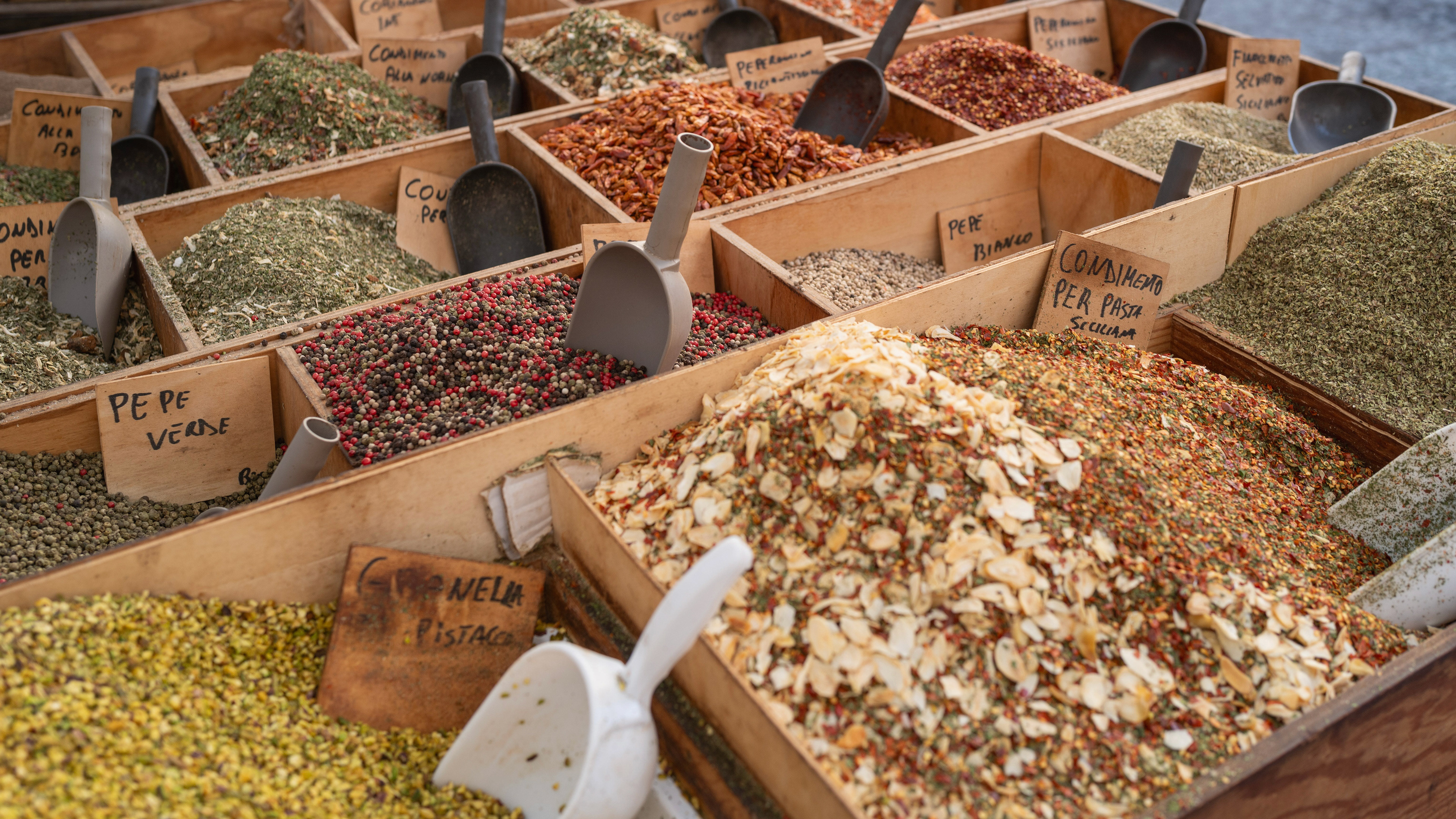 Es dominieren die farbenfrohen Stände mit frischem Obst und Gemüse. Die Stände mit Fisch und Meeresfrüchten stellen eine typisch sizilianische Einzigartigkeit dar, die nur wenige auf der Welt vorweisen können. Hier findet man - je nach saisonalem Angebot -, alle Fischarten des Mittelmeers.