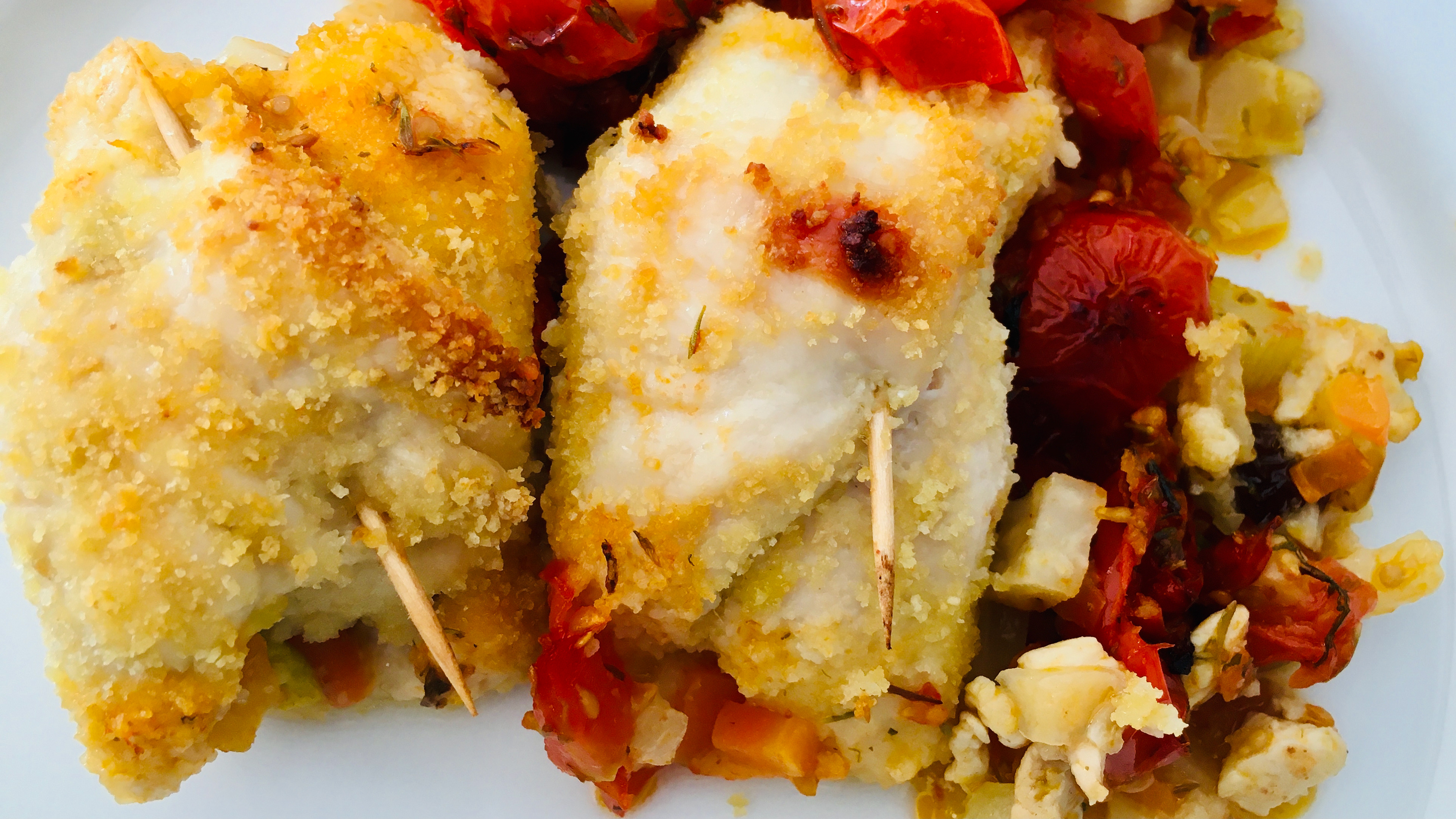Die Pouletbrust mit einem scharfen Messer längs in dünne Scheiben schneiden. Beidseitig leicht salzen und pfeffern. Die Gemüsefüllung auftragen und das Pouletfleisch einrollen. Mit einem Zahnstocher fixieren und mit Olivenöl rundum bestreichen und durch das Paniermehl ziehen. In eine Gratinform geben und mit dem Rest des Gemüses bedecken. Die übrig gebliebene Tomatensauce über die Involtini verteilen.