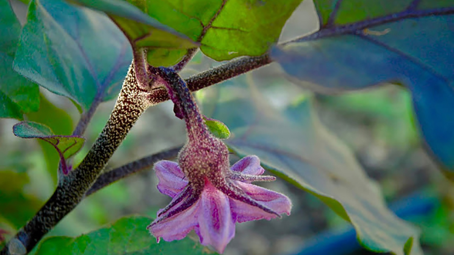 Die violette Blütenkrone ist rundlich, fünfteilig und hat einen Durchmesser von zwei bis drei Zentimeter. Gemäss Wikipedia stammen Auberginen ursprünglich aus Asien, wo sie schon seit mehr als Viertausend Jahren angebaut werden.