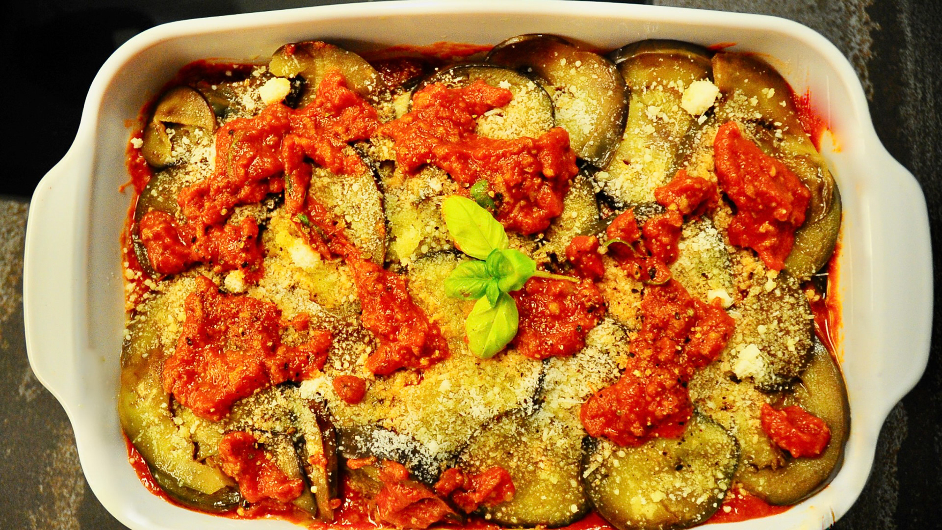 Neben der Aubergine werden in der sizilianischen Küche auch Zucchini, Spargeln oder Artischocken mit Parmesankäse und Tomatensauce schichtweise in einer Form im Backofen überbacken.