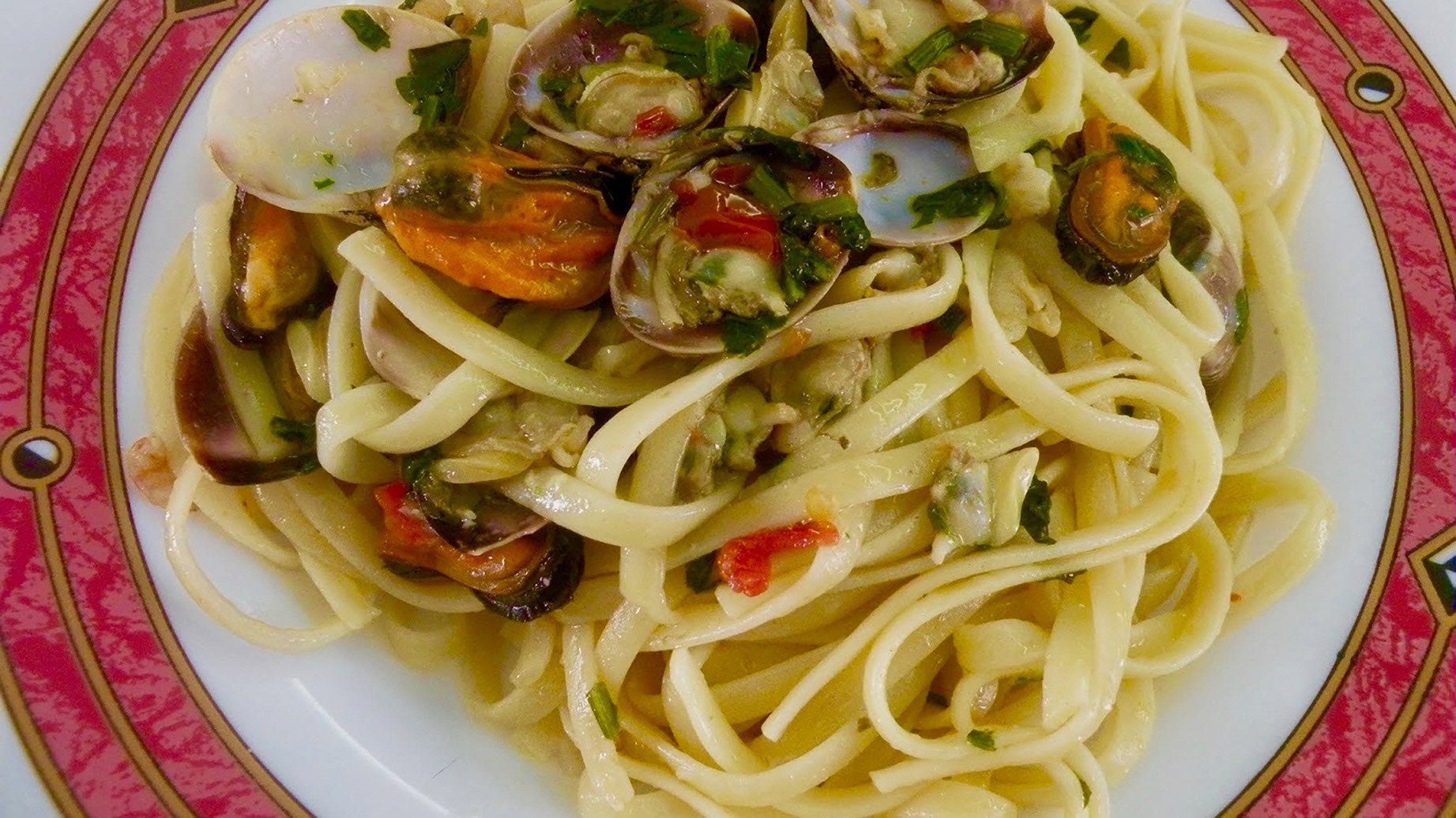 Die aus Meeresfrüchten bestehende Vorspeise wird in Sizilien hoch gehalten. Kleine Seezungen, Meerbarben, Seehechte, Seppioline, Calamaretti, Purpitelli und Garnelen, im Teig ausgebacken, kommen auf die reichhaltige Fischplatte. Rita überrascht uns alsdann mit einem Primo erster Güte: „Linguine alle vongole“.