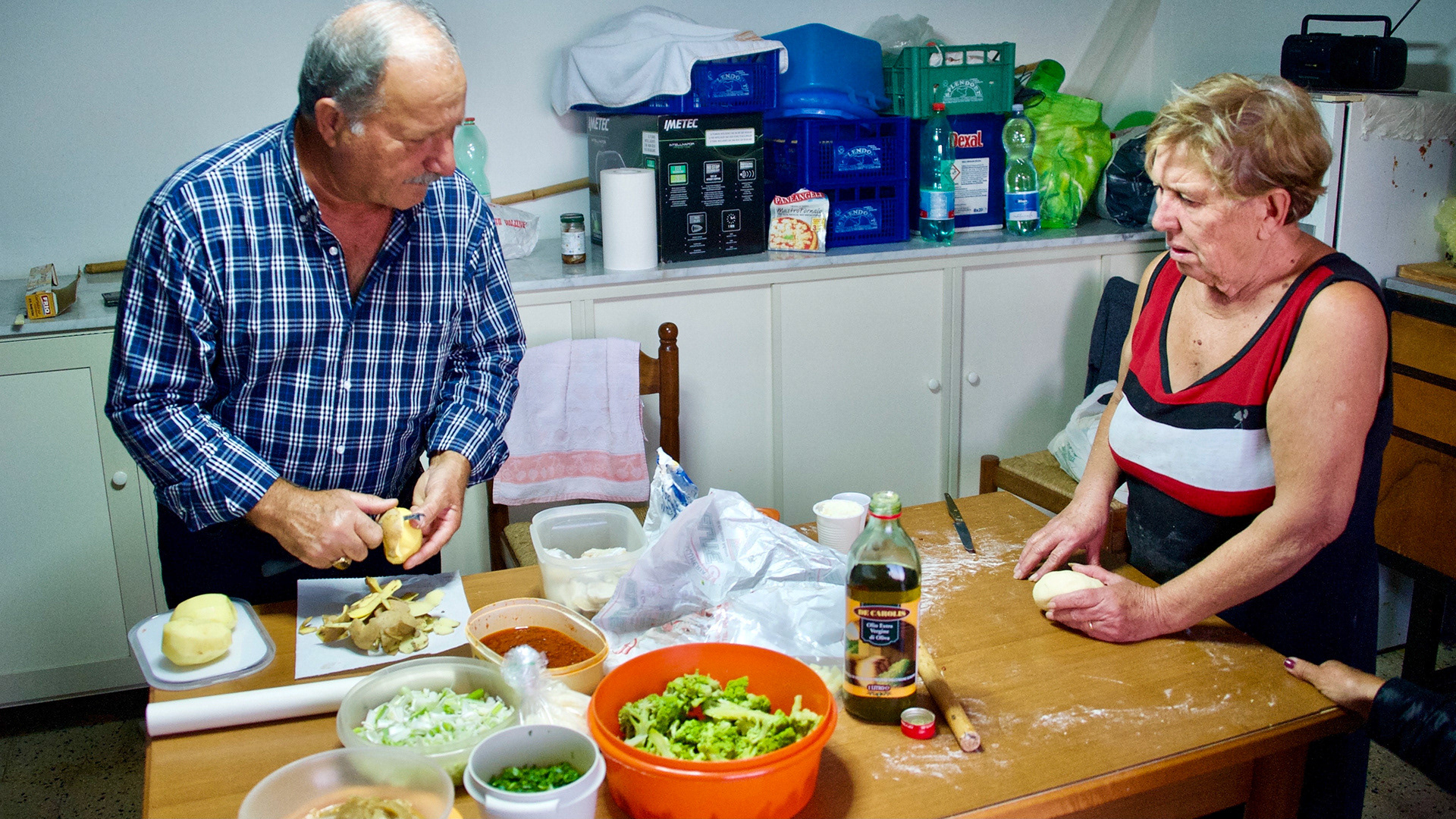 Vor der Zubereitung der Scacce wird der Teig ein weiteres Mal durchgeknetet, in gleich grosse Stücke geschnitten und in ein Tuch eingepackt. Hier ruht der Teig eine weitere Stunde, bevor Rita mit dem Auswallen beginnen kann. Rita und Franco teilen sich die Arbeit. Zuerst werden die Zutaten für die Füllung vorbereitet: Zwiebeln, Lauch, gekochter Schinken, Salsicce, Ricotta, Kartoffeln, Oliven, Käse (Caciacavallo). Franco schneidet den Baccalà (Stockfisch), welchen er besonders gut findet, in mundgerechte Stücke.