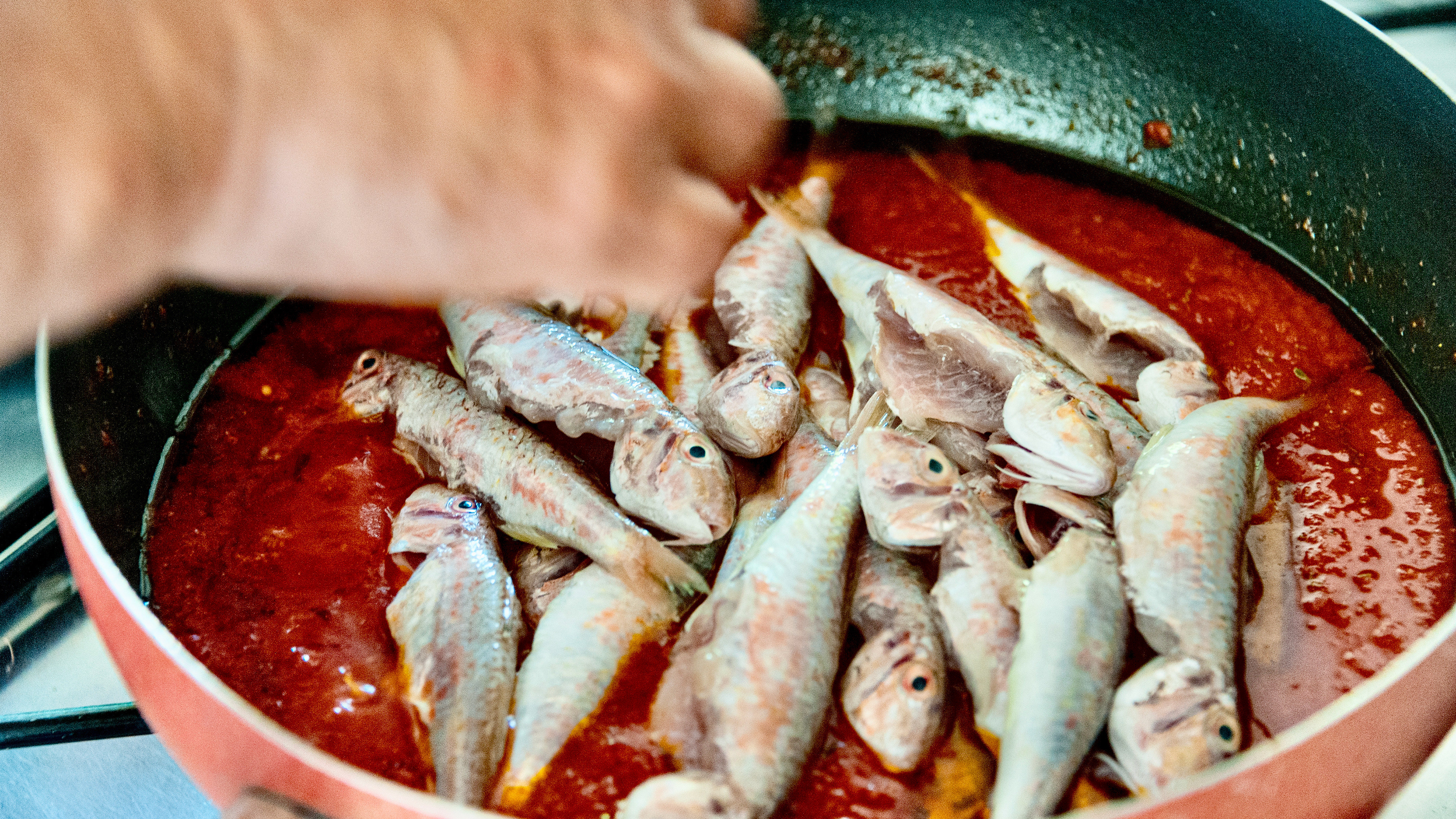 Nachdem die Tomatensauce ca. eine halbe Stunde auf kleinem Feuer geköchelt hat, werden die Knoblauchzehen entfernt. Die Meerbarben werden in der Tomatensauce während ca. 20–25 Minuten auf sehr kleinem Feuer mitgeköchelt. Und schon ist ein einfaches, schmackhaftes Fischgericht servierbereit.