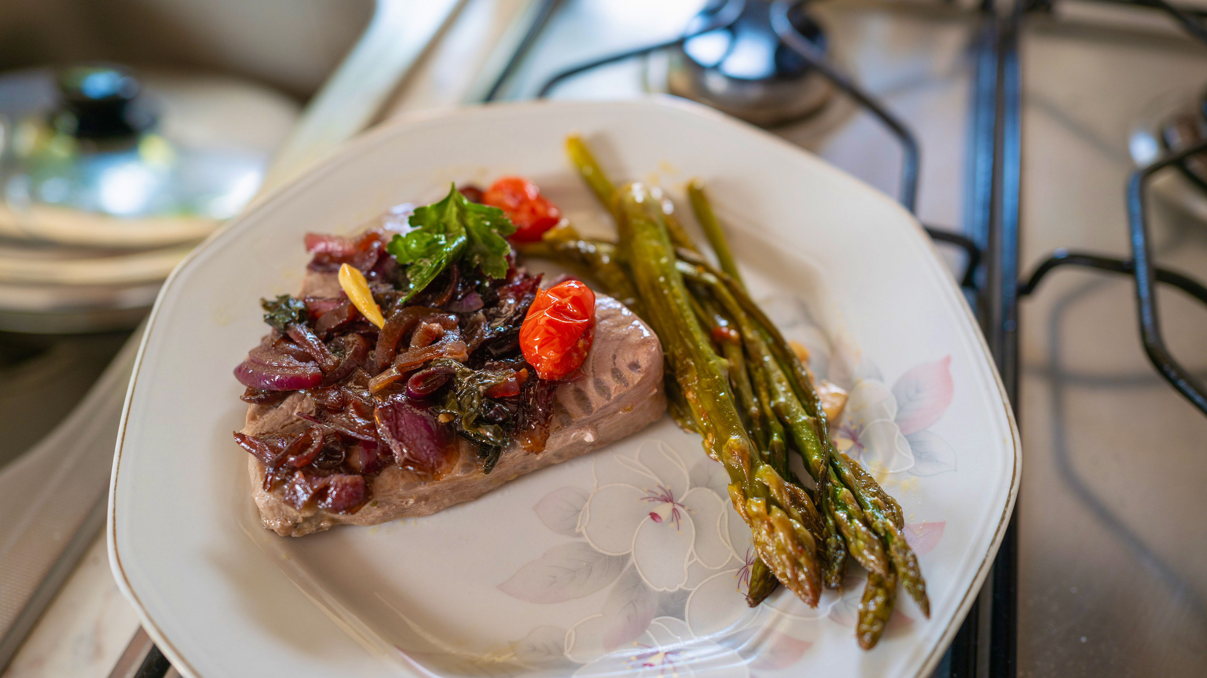 Die Pescheria Blanco ist ein traditionsreiches Familienunternehmen. Mehr als 70 Jahre ist die Firma am Markt. Die Brüder Blanco inspierten mich mit ihren Tipps, sodass ich versuchte, das Rezept "Tonno con la cipolla agrodolce" zu kochen. Zwiebel, Olivenöl und vorzüglicher Thunfisch stehen im Mittelpunkt. Weil gerade auf dem Markt Grüner Spargel erhältlich war, ergänzten wir das Fischmenü damit.