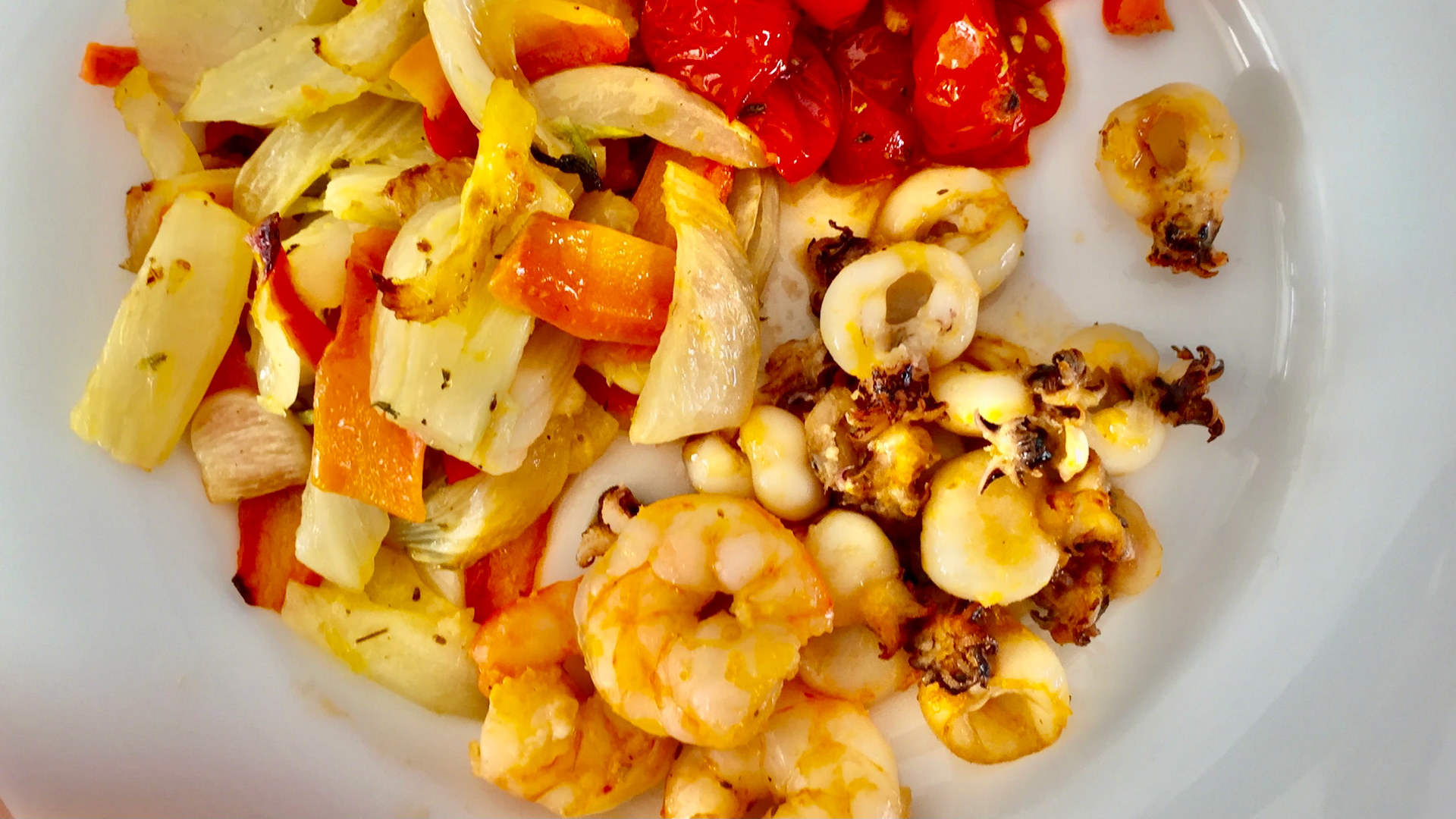 Fenchelgemüse, Peperoni, Crevetten und Tintenfische. Ein einfaches, mediteranes Essen. Foto Franz Eyer