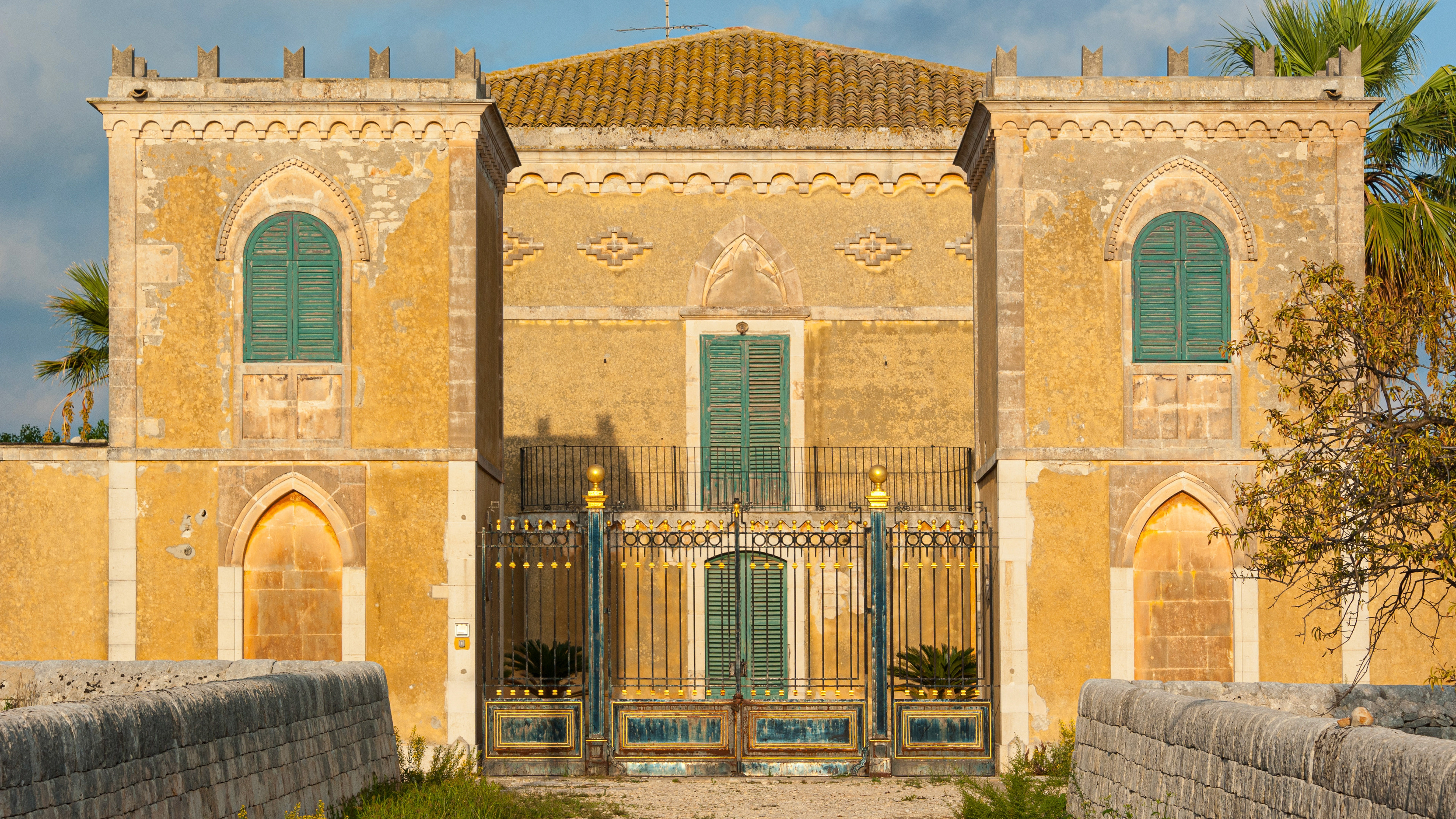 Mich fasziniert dieser Bau mit den grossen Fenstern unter spitzbogigen Lünetten, mit der herrschaftlichen Auffahrt und der Geschützstellung aus dem Zweiten Weltkrieg in der Umfassungsmauer, von wo aus man versuchte, den Hafen von Pozzallo und das Hinterland in Richtung Modica gegen die Alliierten zu verteidigen.